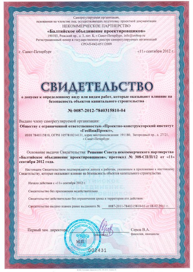 ООО «ПКИ «ГеоИнжПроект» является действующим членом СРО «Балтийское объединение проектировщиков» (рег. номер члена СРО №87 от 03.11.2009 г.).